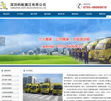 深圳南山搬家,羅湖搬家,福田搬家網站建設公司,做網站優(yōu)化關鍵詞排名SEO,營銷型,手機網站建設,響應式,品牌型,電商/門戶,深圳南山搬家,羅湖搬家,福田搬家外貿型網站建設. 深圳搬遷公司成立于1996年,是深圳特區(qū)最早成立并以“螞蟻搬家”注冊的獨資深圳搬遷公司。