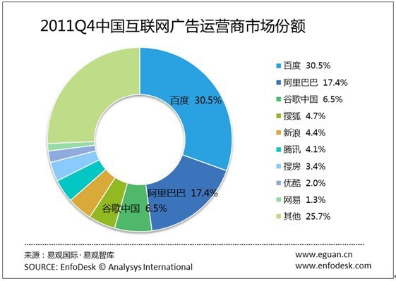 【TechWeb報(bào)道】一月三十一日信息息,EnfoDesk易觀智庫(kù)產(chǎn)業(yè)數(shù)據(jù)庫(kù)發(fā)布的《2011年第4季度中國(guó)網(wǎng)絡(luò)廣告市場(chǎng)季度監(jiān)測(cè)》數(shù)據(jù)顯示,百度、阿里巴巴、谷歌中國(guó)位居前三,百度占到中國(guó)互聯(lián)網(wǎng)廣告市場(chǎng)份額的百分之三十,阿里巴巴占到17.4%,谷歌中國(guó)占到6.5%。百度:30.5%,阿里巴巴:17.4% ,谷歌中國(guó):6.5%,新浪(不包含新浪樂居業(yè)務(wù))4.7%、搜狐:4.7%、騰訊4.1%、網(wǎng)易1.3%,搜房3.4%、優(yōu)酷2.0%,其他:25.7%