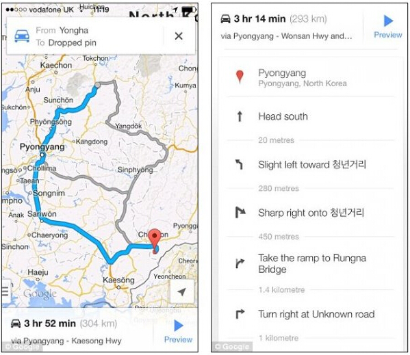 雖然谷歌地圖在朝鮮也能顯示火車和地鐵線路,但不能像其他地區(qū)一樣提供時間信息。因為朝鮮限制了許多重要信息,這也許是因為谷歌在韓國首爾有分部而朝鮮沒有,這違反了朝鮮的法律——因此不提供重要信息給谷歌。