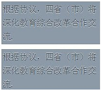 <head> <meta charset="UTF-8"> <title>Document</title> <style> body{ font: 110%/1.6 Baskerville, Palatino, serif; /*字體過小表現(xiàn)不出樣式*/ } .wrap{ width: 200px; background: hsl(210, 13%, 60%); color: hsl(210, 13%, 30%); padding: .1em; text-shadow: 0 1px 1px hsla(0, 0%, 100%, .8); } .wrap02{ margin-top: 10px; width: 200px; background: hsl(210, 13%, 60%); color: hsl(210, 13%, 30%); padding: .1em; text-shadow: 0 -1px 1px hsla(0, 0%, 100%, .8); } </style> </head> <body> <div class="wrap"> <span>根據(jù)協(xié)議,四?。ㄊ校⑸罨逃C合改革合作交流.</span> </div> <div class="wrap02"> <span>根據(jù)協(xié)議,四?。ㄊ校⑸罨逃C合改革合作交流.</span> </div> </body>