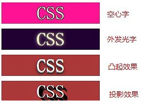 <head> <meta charset="UTF-8"> <title>Document</title> <style> .wrap{ text-align: center; font-size: 38px; width: 200px; background: deeppink; color: white; text-shadow: 1px 1px black, -1px 1px black, -1px -1px black, 1px -1px black; } .wrap02{ margin-top: 10px; font-size: 38px; width: 200px; text-align: center; background: #203; color: #ffc; transition: 1s; } .wrap02:hover{ text-shadow: 0 0 .1em, 0 0 .3em; color:transparent; } .wrap03{ margin-top: 10px; width: 200px; font-size: 38px; text-align: center; color: white; background: hsl(0,50%,45%); text-shadow: 0 1px hsl(0, 0%, 85%), 0 2px hsl(0, 0%, 65%), 0 3px hsl(0, 0%, 45%), 0 4px hsl(0, 0%, 25%), 0 5px hsl(0, 0%, 5%), 0 5px 10px black; } .wrap04{ margin-top: 10px; width: 200px; font-size: 38px; text-align: center; color: white; background: hsl(0,50%,45%); text-shadow: 1px 1px black, 2px 2px black, 3px 3px black, 4px 4px black, 5px 5px black, 6px 6px black, 7px 7px black, 8px 8px black; } </style> </head> <body> <div class="wrap"> <span>CSS</span> </div> <div class="wrap02"> <span>CSS</span> </div> <div class="wrap03"> <span>CSS</span> </div> <div class="wrap04"> <span>CSS</span> </div> </body>